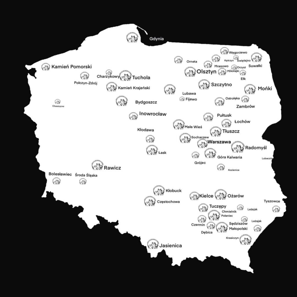 Od 2024 prowadzimy Akcję Kastrację, w ramach której w 2024 roku sfinansowaliśmy kastracje 1242 kotów w wielu mniejszych ośrodkach w całej Polsce. W 2025 roku były to już 3033 koty! Na mapce wszystkie ośrodki, do których dotarła Akcja – i działamy dalej